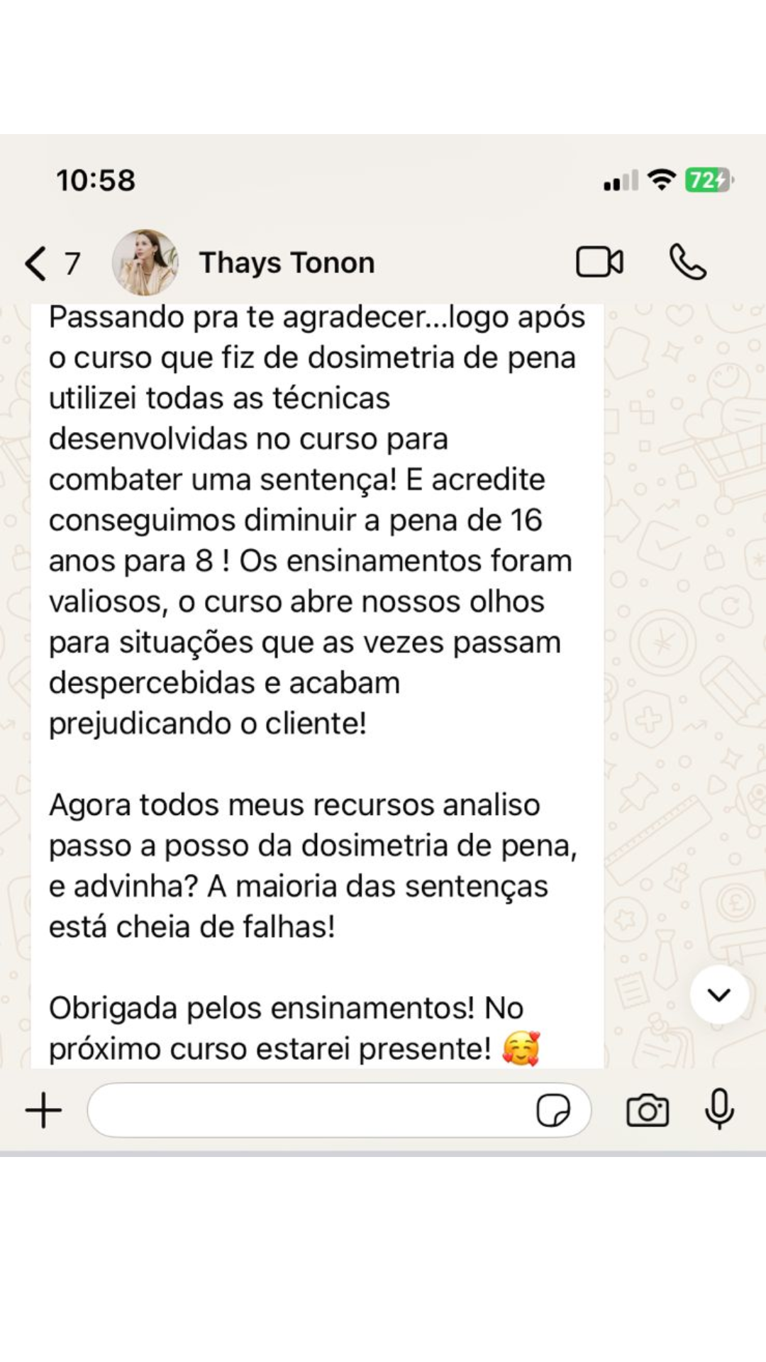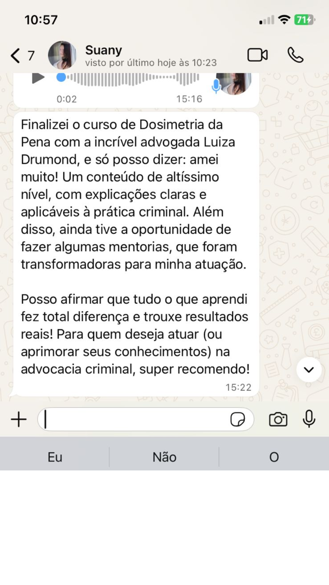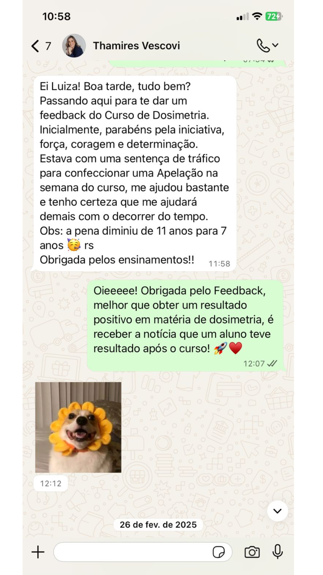 "Com o curso da Dra. Luíza, consegui entender dosimetria de forma correta e reduzi a pena do meu cliente. Com a redução, a progressão de 2031 caiu para 2025, um resultado que fez total diferença na minha advocacia criminal."