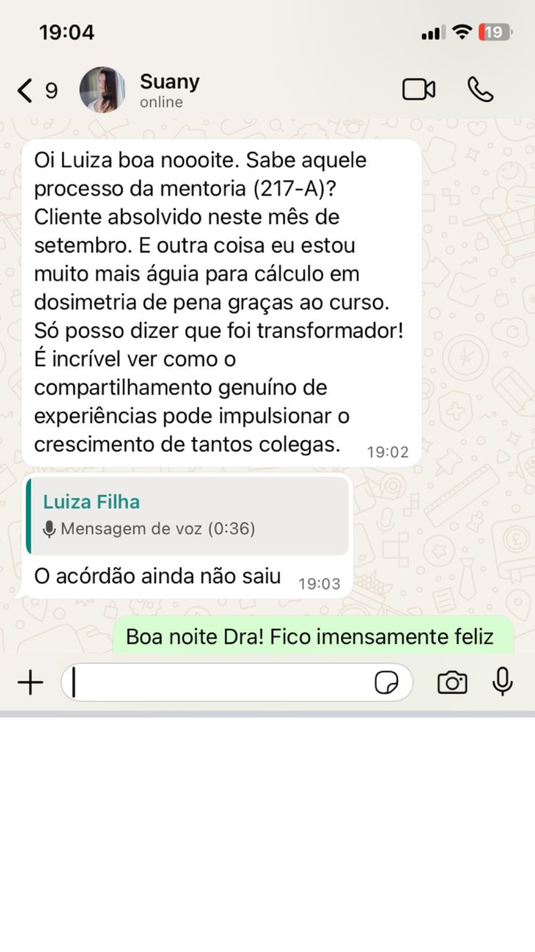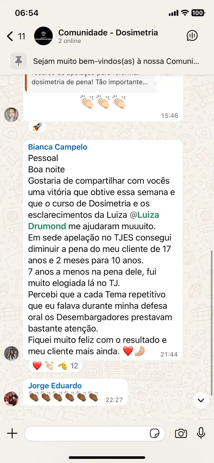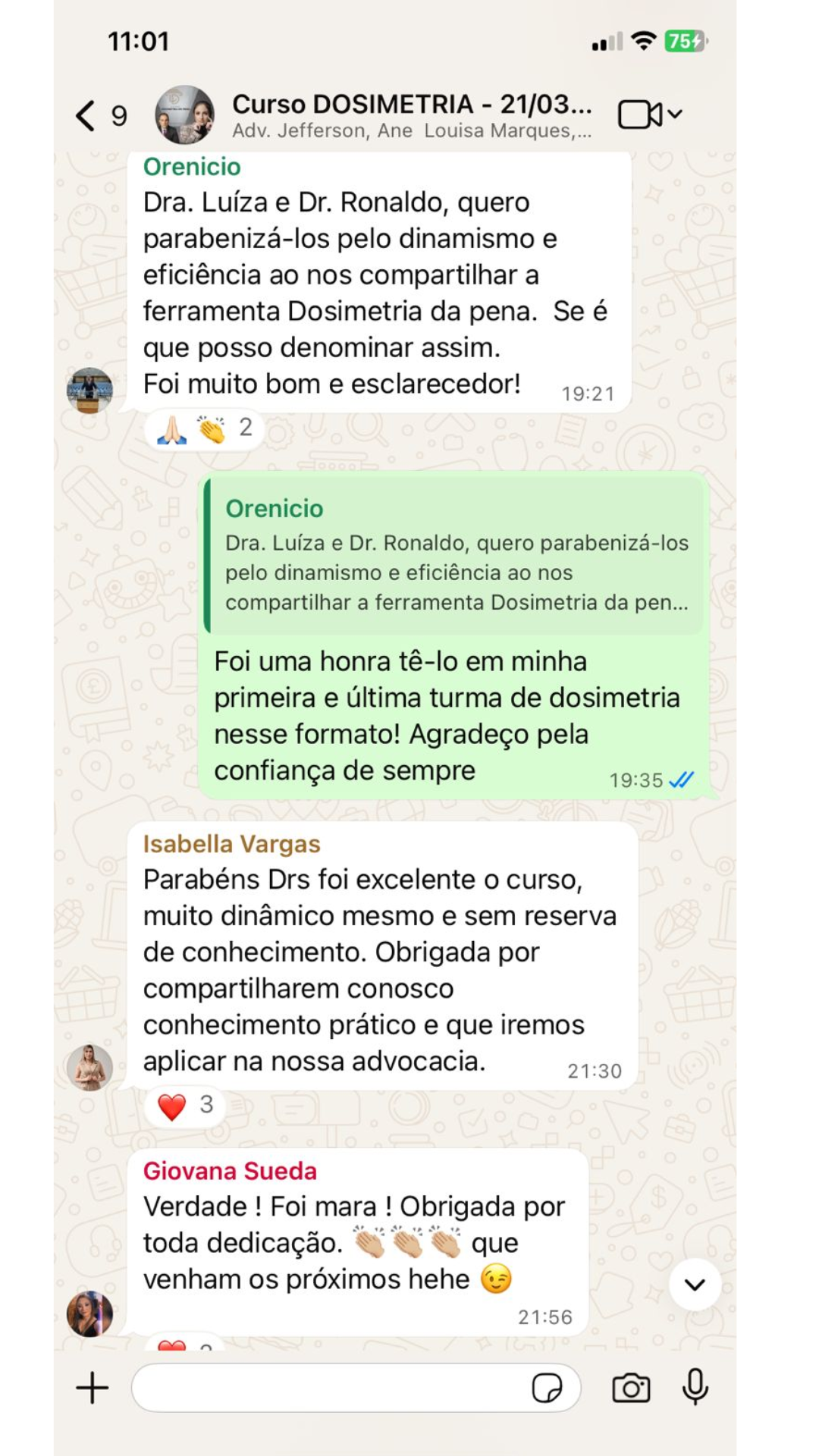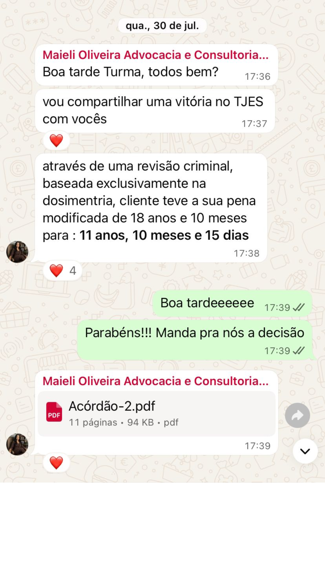 "Com o curso da Dra. Luíza, consegui entender dosimetria de forma correta e reduzi a pena do meu cliente. Com a redução, a progressão de 2031 caiu para 2025, um resultado que fez total diferença na minha advocacia criminal."